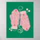 Um par de mitenes cor-de-rosa adornada com intrincados padrões de mandala repousa sobre um fundo verde vibrante. Cada luva apresenta sotaque cardíaco e é conectada por uma corda branca com pom-poms fofos, exuando calor festivo e desejos alegres.
