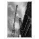 Uma grua de construção e seus contrapesos de várias toneladas com faixas de nuvens atrás delas. Filme preto e branco mostra a geometria dentro das travas do sistema de guindaste e roldana. Para dar à grua uma perspectiva única, seu braço está alinhado com seu fazer base, uma escada até o céu do canteiro de obras. Fotografia a preto e branco de 35 mm. Copyright ©Claire E. Skinner. Todos os direitos reservados.