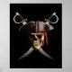 Crânio pirata, mancha de olho, chapéu pirata e duas espadas cruzadas para um clássico Jolly Roger.