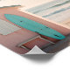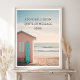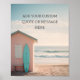 Add a splash of summer and surf to your space with this playful retro-style beach poster. Featuring a pastel pink surf shack, turquoise board, and a soft golden sky over gentle waves, this design captures the essence of carefree coastal living.
