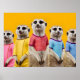 Grupo Criativo de Meerkat em "Bright Fashionable". Este conceito de animal criativo apresenta um grupo de meerkats vestidos de roupas vibrantes e modernas. Coloque sobre um fundo sólido.