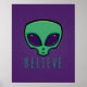 Ilustração da cabeça de alienígena de desenho animado com grandes olhos escuros com letra "Acredite".