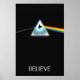 Imagem de um porco voador silenciada contra a luz do sol dentro de um design de prisma. A palavra acredita está por baixo.
