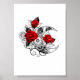 Contorno, lua da crista mecânica com engrenagens, decorada com rosas vermelhas com caules e folhas pretas em fundo branco. Steampunk
