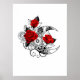 Contorno, lua da crista mecânica com engrenagens, decorada com rosas vermelhas com caules e folhas pretas em fundo branco. Steampunk