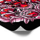 A cabeça de um dragão vermelho assustador domina o centro da imagem, seus olhos brilhando com fúria. A boca do dragão está aberta, revelando dentes afiados, e suas garras são estendidas, segurando crânios. O fundo apresenta padrões intrincados, florais e linhas giratórias.