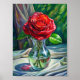Uma rosa vermelha vibrante floresce graciosamente em um vaso de vidro transparente, suas pétalas profundas irradiando calor e paixão. A transparência do vaso permite à luz dançar, destacando os delicados detalhes da flor. A rosa é alta em meio a folhas verdes e peludas, criando um belo contraste contra a toalha prateada por baixo. A superfície brilhante da prata adiciona um toque de elegância, refletindo as cores e aprimorando a beleza geral do arranjo. Essa composição expele um senso de romance e sofisticação, convidando a admiração e criando um ambiente sereno.