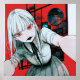 Uma anime com olhos vermelhos impressionantes dá um olhar intenso.