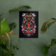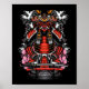 A imagem mostra um poderoso guerreiro samurai sentado em uma plataforma, adornada em ornamentado, armadura vermelha samurai. Seu capacete apresenta detalhes complexos e uma expressão feroz. Um katana, descansa ao seu lado. O fundo é enfeitado com flores de cereja e ondas giratórias