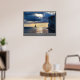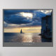 A poster com a fotografia de um veleiro navegando em frente às casas na frente da água em Rovinj, Croácia, durante o pôr do sol.