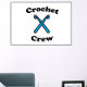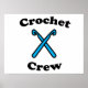 Um design de crochê engraçado que diz Crochet Crew em volta de duas agulhas de gancho azul.