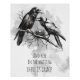 Arte lisa negra e branca de um par de corvos, com o seu ninho contendo um ovo. Um fundo de lavagem com aquarela, você pode adicionar qualquer cor de fundo que quiser, nós deixamos este branco. Com o texto personalizável, "e aqui na espera há graça". © trabalho artístico original por WhimsicalArtwork