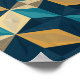 Um padrão geométrico sem descontinuidades, com ilusões semelhantes a cubos 3D criadas a paralelogramas. O design combina tons marinhos profundos azuis, turquesas, beige e amarelo mostarda, formando um efeito abstrato como cristal. A repetição e sombreamento dão ao padrão uma aparência tridimensional, fazer adequado para papéis de parede modernos, têxteis e fundo digital.