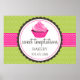 © 2013 Designs socialitas. Design de poster elegante incorporando um cupcake com gelo cor-de-rosa e xícara de ponto polca. Seu texto entra em uma faixa circular com uma borda escalada. Uma fita rosa elegante com pontos poca adiciona um toque vibrante. O fundo tem um padrão verde.