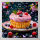 Cupcake trabalhado de forma elegante, com destaque para uma espiral de glacé rosa macio sobre uma base marrom-ouro. O glacé é adornado com bagas frescas, incluindo cerejas e mirtilos, e manchado com folhas de menta. Ao redor do cupcake estão bagas espalhadas e pétalas florais vibrantes, criando uma atmosfera festiva. Um borrifo do que parece ser uma relva comestível adiciona um toque de brilho, aumentando a alergia geral desta deliciosa sobremesa. O fundo é escuro, o que contrasta bem com as cores vibrantes do cupcake e suas decorações.