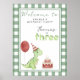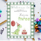 Watercolor kids birthday party. Watercolor Dino in birthday hat, cake with candles, red balloon. Green cage background.