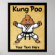 Um humorístico mestre de karatê de cinturão negro, com um poo emoji como cabeça, numa posição de luta. Leitura de texto, "Kung Poo" aparece acima da imagem. Personalize adicionando seu próprio texto adicional.