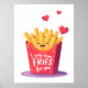 A cute and colorful cartoon illustration of a red French fries carton with a happy kawaii smiling face. The design features a floating red heart and the romantic funny pun quote "I only have FRIES for you". The image has a white sticker border, making it perfect for Valentine's Day greeting cards, fast food lovers, and humorous romantic gifts. Isolated design.