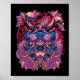 Uma ilustração futurista, inspirada no ciberpunk, mostrando uma máscara de oni com olhos brilhantes, néon e um visor futurista. A máscara é cercada por um cobra, crânios, rosas e correntes enrolados.