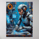 Essa pintura retrata um ciborgue ou robô feminino focado em uma tarefa em um terminal computacional futurista. Ela é renderizada em uma blindagem metálica elegante com sotaques laranja brilhantes em seu capacete e corpo. O fundo é uma complexa rede de telas e maquinaria de computadores, todas pintadas com pesada textura prejudica o estilo. A trabalho de arte combina um tema de ficção científica com uma estética rica e paixonada, criando uma cena cativante de um futuro espaço de trabalho.