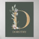 Florial da letra D monograma. A letra D, de textura castanha ouro, acentuada com folhas compostas de cor aquosa verde, flores e pó de ouro. Personalizado com o nome na fonte correspondente.