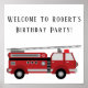 O caminhão de bombeiros vermelho na faixa de festa de aniversário quadrada de uma criança branca. O texto diz, "Bem-vindo à festa de aniversário YOURNAME." Entre em contato conosco para obter ajuda com a personalização ou para solicitar produtos correspondentes.