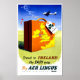 Poster de viagens vintage de restaurada e melhorada digitalmente mostrando uma mala na qual está uma silhueta de Excelentes da Grã-Bretanha, da Irlanda e do Nordeste da França mostrando rotas aéreas. Uma etiqueta de bagagem com uma pedra de champanhe está anexada à mala. O sobrevoo voa em um avião. Imperfeições removidas. Cores corrigidas. Imagem cortesia da Biblioteca do Congresso.