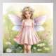 Uma linda menina fada com asas cor-de-rosa suaves em meio a flores em flor. Sua coroa de margaridas e sorriso gentil criam uma sensação mágica e pacífica. Perfeito para quartos de crianças, berçários ou qualquer pessoa que ame fadas e natureza.