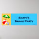 Uma festa ou poster de sala personalizados com letras retrorreflectoras azuis e arte de uma bola de praia, guarda-chuva de piscina e outros bens essenciais para natação ou bronzeamento.