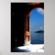 Uma velha porta de madeira se abre num paraíso de água azul.