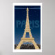 Renderização colorida da Torre Eiffel contra um céu estrelado com as luzes de Paris abaixo.
