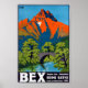 Poster de viagens vintage restaurada e digitalmente aprimorada mostrando um rio com uma ponte rochosa em frente às grandes montanhas. Imperfeições removidas. Cores corrigidas.