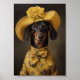 O elegante chic Dachshund no estilo do pintor holandês Frans Hals. Cachorro bonito vestindo um vestido amarelo e chapéu com flores amarelas