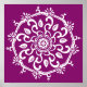 Esta mandala branca senta-se sobre um fundo roxo quente. A cor é luxuosa e criativa. Parte da coleção Payon Mandala.