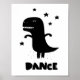 Poster escandinava com dinossauro dançando. Impressão de crianças brancas e pretas.
