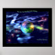 Poster com a minha trabalho de arte digital do planeta Terra no espaço cercado por auroras coloridas, estrelas e notas musicais com texto "no dia em que a Terra parar de cantar, nós paramos de dançar".