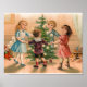 Linda imagem de vintage mostrando quatro crianças dançando ao redor de uma árvore de Natal.