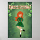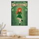 Este poster de dança irlandês apresenta um dançarino irlandês com cabelo vermelho com fundo de shamrock verde.