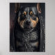Um rottweiler com um aspecto feroz numa jaqueta de couro preto e correntes.
