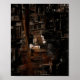 The painting of a bookshelf in a library in dark academia style.