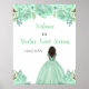 Este doce sinal de 16 boas-vindas contém flores florais verdes, brilhantes e falsas, e uma bela princesa com pele escura e um vestido elegante. Isto é perfeito para uma doce festa de aniversário de dezesseis.