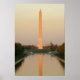 Foto do Monumento de Washington e piscina refletora no pôr do sol. Tirada dos degraus do Memorial Lincoln.