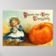 Imagem de Ação de Graças Vintage de uma garotinha num vestido azul segurando uma colher e olhando para uma abóbora. No canto superior direito diz "Desejando-lhe uma Ação de Graças feliz".