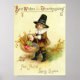 Imagem de Ação de Graças Vintage de um garoto peregrino carregando um cheio de fruta e vegetais. No topo da carta, diz "Melhores Desejos para Ação de Graças" e no final diz "Para Auld Lang Syne", que é uma canção popular que foi cantada na véspera de ano novo.
