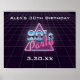 poster do Partido anos 80 com uma tipografia retrô estilo de 'Partido anos 80'. Designs incluem elementos de roxo escuro, blues e pinks, elementos futuristas de ficção científica dos anos 80, triângulo e grade. Personalizar com evento e data.