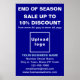 Poster que você pode usar como material de marketing para sua empresa para atrair mais clientes em cada final de temporada. Poster personalizável com venda de fim de estação, seu nome comercial e outras informações. Personalize-o e use-o para convencer mais clientes a comprar de seus produtos ou clientes para gostar de seus serviços no final da temporada. As cores e formas design são textos claros, azuis e brancos sobre fundo azul e forma retangular de formato de retrato. O conteúdo é o fim da temporada, venda, desconto percentual que você oferecerá, datas de venda, seu nome comercial, logotipo, endereço, número de telefone, e-mail e site ou sua página de mídia social. Verifique a aparência após carregar o logotipo e digitar textos. Se a aparência lhe agrada, você pode colocar seu pedido agora. Se você precisar redimensionar e mover o logotipo e os textos para o ajustado neste poster ou em outro tamanho, forma e estilo apropriados que você escolherá, mude na ferramenta design. Você também pode fazer outras alterações na ferramenta design de acordo com a aparência deste poster, que você prefere, como alterar a cor do fundo, a cor da fonte e o estilo da fonte. Desejando mais vendas neste fim de temporada e em todas as estações.