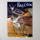 Um poster vintage de Jean de Paleologue para Franco American Bicycle Co. por volta de 1893. Uma mulher vestida de fofoca andando de bicicleta. Um falcão branco senta-se na mão dela.