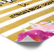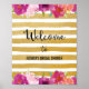 Poster impressão para sinal de boas-vindas com flores cor-de-rosa, flores de fochsia design e fundo de tiras de folhas de ouro falsas.