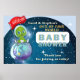 Bem-vindos convidados ao seu chá de fraldas com esta poster colorida e divertida de 36"x24" que apresenta um bebê de alienígena verde giro numa fralda sentada sobre um planeta entre as estrelas. Uma bandeira vermelha lendo "Bem-vindo" transmite a mensagem. Atualize o texto à medida que você vê o ajustado - sua decisão mais difícil será pendurá-lo ou enquadrá-lo!