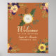 Poster de boas-vindas ao casamento elegante, moderno e rústico de terracota com iniciais de monograma, girassol amarelo, flores cor-de-água rosa e verde. Escolha perfeita para casamentos outono românticos!